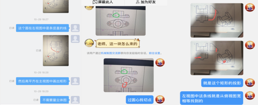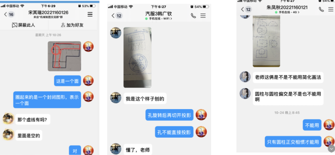 机械设计制造教研室的大部分教师认真备课,根据线上教学特点把课件重新进行了调整,使课件内容更为精练,同时增加了直观性强的图片辅助教学。机械设计制造教研室的张炜炜老师讲授的课程主要为《机械制图》《工程制图》,为了保障教学效果,张炜炜老师对课程中操作性比较强的内容,比如制图中平面图形的绘制、叠加式组合体三视图画法等,采用腾讯会议打开视频用手机俯拍的形式演示绘图过程;王艳雪老师每次课前都让学委收集学生不会的习题,提前30分钟进入腾讯会议,为学生答疑,下课后,王老师还会留20分钟左右的答疑时间,及时解决学生当堂遇到的问题。会议结束后,鼓励学生通过学习通或QQ问问题,及时进行答疑。