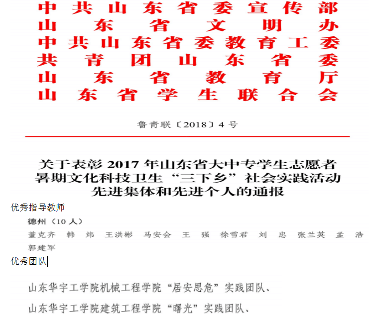 为表彰先进,推动“三下乡”社会实践活动持续深入开展,探索完善长效机制,提升育人效果。省委宣传部、省文明办、省委高校工委、团省委、省教育厅、省学联决定,对在2017年“三下乡”社会实践活动中表现突出的优秀组织单位、优秀指导教师和优秀学生给予表彰。