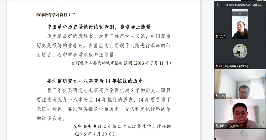 为扎实推进党史学习教育,以百年党史涵养师德,11月22日,机械工程实验中心线上召开了师德师风专题学习活动,李璇老师主持学习活动,实验中心全体教师参加了活动。