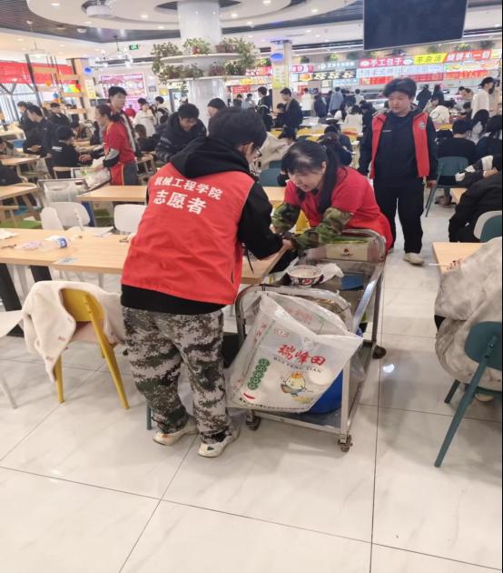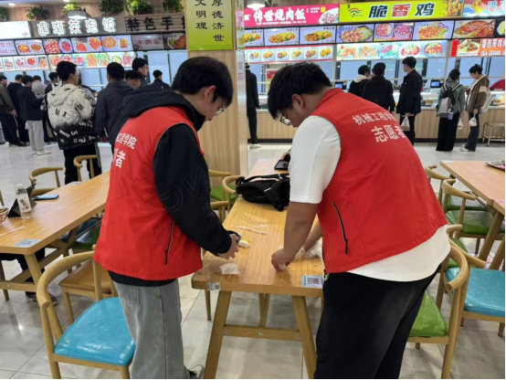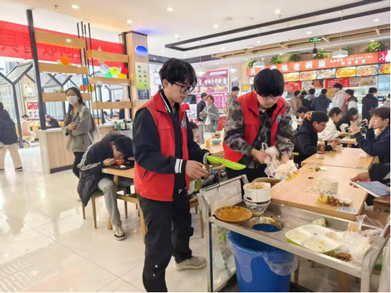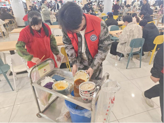 活动期间,志愿者们身着红马甲,分时段中午晚上在四餐厅开展服务。在就餐高峰时段,他们化身“秩序引导员”,在餐厅桌子旁提醒排队礼让;担任“光盘监督员”,提醒同学倡导节约粮食;化身“清洁协管员”,主动协助食堂阿姨回收餐盘、擦拭餐桌。
