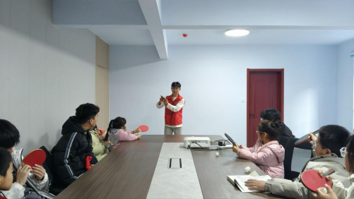 活动当天,大学生志愿者们早早来到现场布置,分发球拍和乒乓球,引导居民有序排队参与。在轻松愉快的氛围中,大学生志愿者们用通俗的语言向大家讲解乒乓球的握拍、发球等基础规则,现场孩子们认真听讲,积极举手提问、参与互动,时不时还传出阵阵欢笑声。