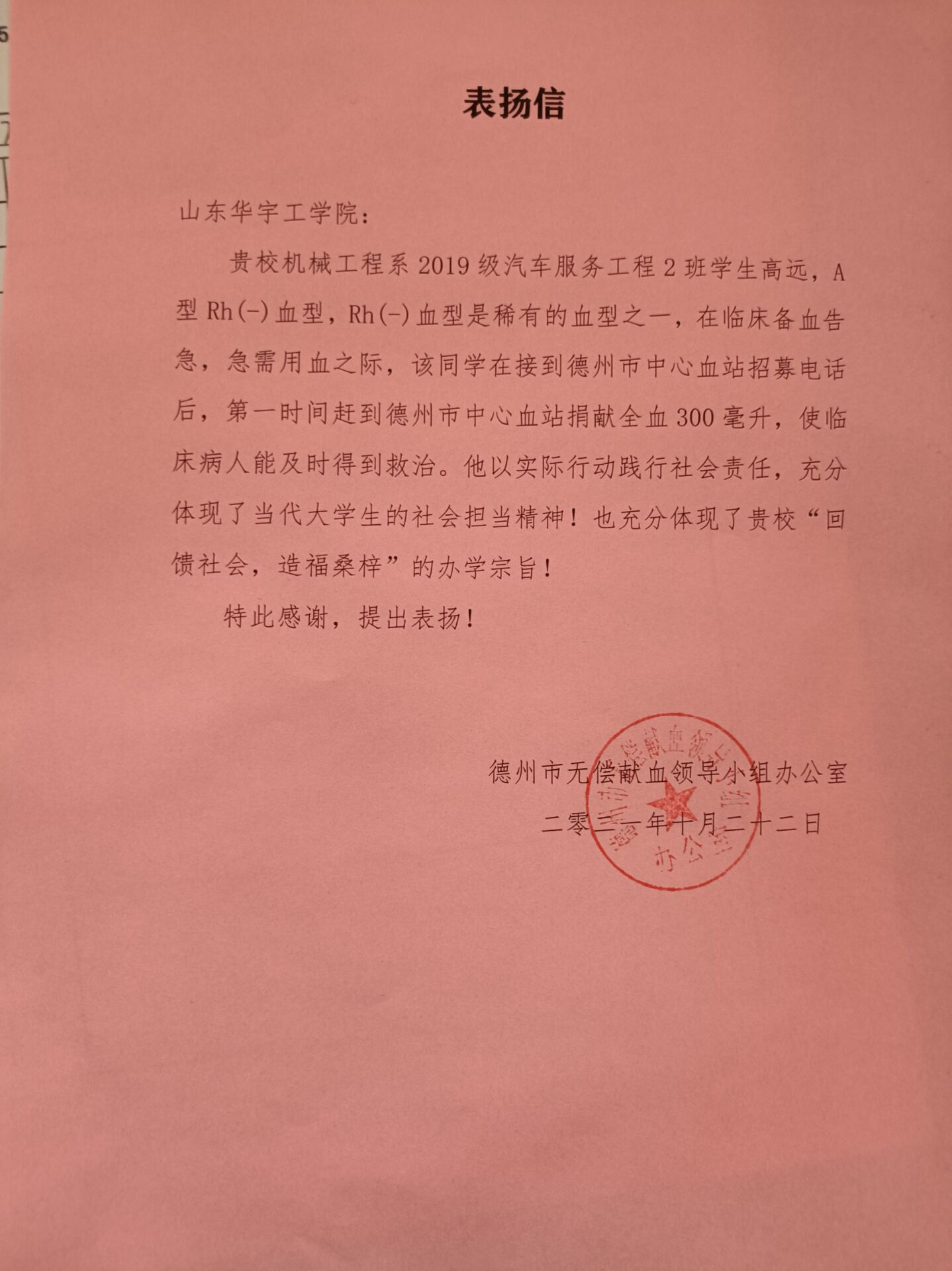 19本科汽服2班高远同学,为A型Rh(-)血型。(Rh-)血型是稀有的血型之一,在临床备血告急,急需用血之际,高远同学在接到德州市中心血站招募电话后,第一时间赶到德州市中心血站捐献全血300毫升,使临床病人能及时得到救治。该生以实际行动践行社会责任,充分体现了当代大学生的社会担当精神。