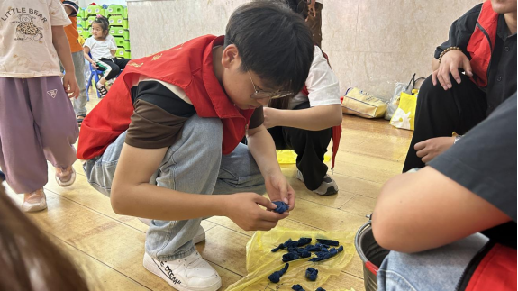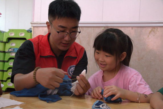 活动开始前,志愿者向参与活动的小朋友介绍了有关扎染的历史和种类,讲解了扎染的基本内容以及具体制作步骤和捆扎手法。随后小朋友们在志愿者们的指导帮助下,通过体验捆绑、夹结、缝绞、着色等手法,完成了扎染作品制作,并在实践中感受手工艺术古朴自然之美。